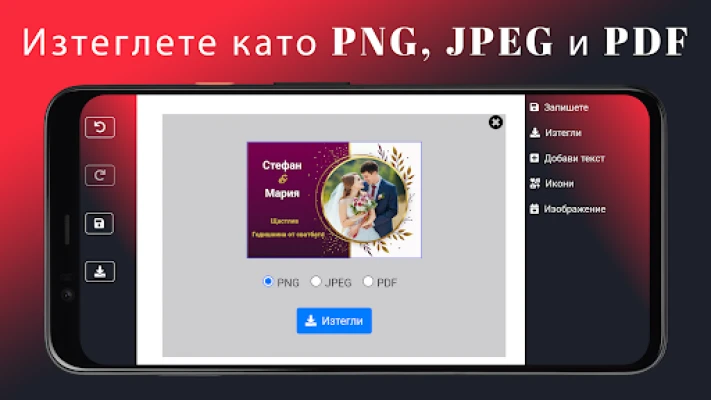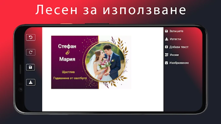 Преобразете всеки специален момент в незабравимо произведение на изкуството с приложението за сватбена покана и картичка за годишнина от сватбата. Независимо дали планирате най-важния ден в живота си или отбелязвате годишнина от дългогодишна любов, този интуитивен инструмент ви дава възможност да създавате елегантни и персонални покани и картички, които ще впечатлят всеки гост. Забравете за скучните и еднообразни дизайни – сега можете да изразите своята индивидуалност с лекота и стил.