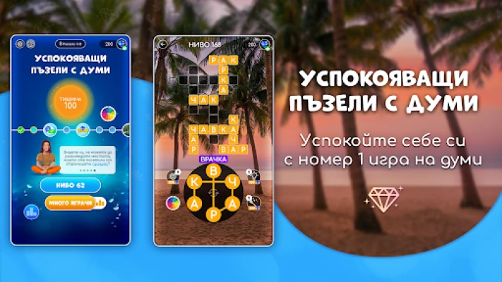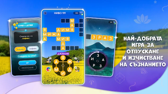 Потопете се в успокояващи пъзели с думи, докато пътувате до над 200 живописни локации в 50+ страни. Отпуснете съзнанието си от стреса с тази пристрастяваща игра, която започва лесно и става предизвикателна. Насладете се на безплатна игра без скрити условия.