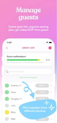 Започнете с пълния контрол върху задачите си с нашия изчерпателен списък, който ви помага да организирате всяка стъпка. С удобни категории и интелигентна система за напомняния ще бъдете сигурни, че нищо няма да бъде забравено и всичко ще върви по план. Управлявайте списъка с гости с лекота, като импортирате контакти директно от телефона си и проследявате потвържденията за присъствие в реално време. Вече няма да има главоболия с кой е потвърдил и кой не, а комуникацията ще бъде безпроблемна. Не по-малко важно е и финансовото планиране – с вградения калкулатор за бюджет ще следите разходите си прецизно, ще виждате актуални статистики и ще останете комфортно в предварително зададените лимити.